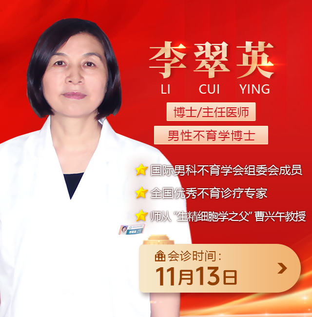 李翠英博士:与“生精细胞学之父”曹兴午教授并称我国男性不育“互证治疗”的“黄金搭档”,长期从事不孕不育的研究和临床工作,在中医中药领域拥有很高的造诣。善于利用传统医学精华,中西医合璧治疗少精症、弱精症、死精症、无精症、不射精症、逆行射精症及睾丸发育不良等男性不育疑难病症。在治疗男性不育方面拥有丰富的诊疗经验及独特的疗法。点击在线咨询,预约专家会诊名额