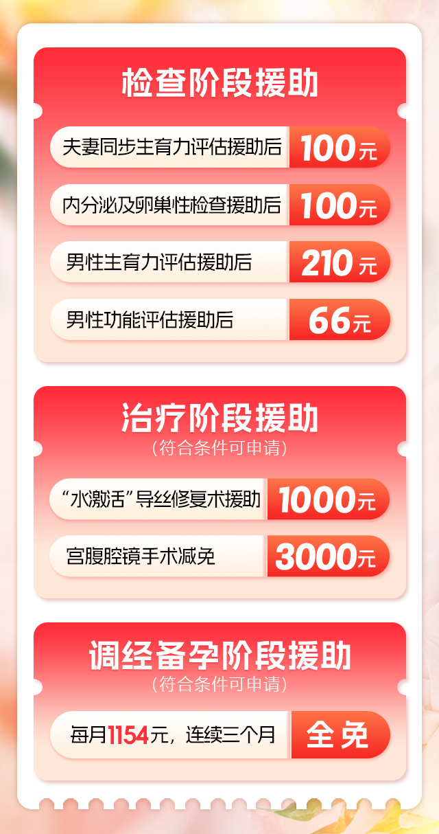 为切实减轻不孕不育家庭的就医负担,送子公益基金完善援助体系,特推出“全周期援助:检查、会诊、治疗、助孕”一站式服务。这一模式优化了传统就医流程,实现“一次申请,全程补贴”的高效衔接。送子公益基金全程陪伴,全力护航,助您早日实现生育愿望。